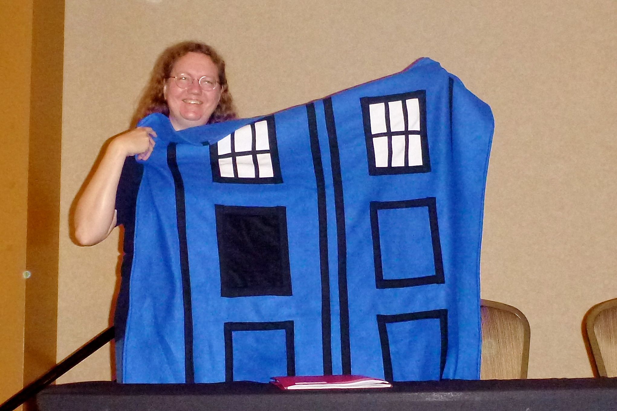 I had a blast at ApolloCon 2014, moderating two panels and participating in two others. One end of the hotel was much colder than the other, so I got a nifty TARDIS blanket to keep me warm … perfect for the Dr. Who panel I was moderating.