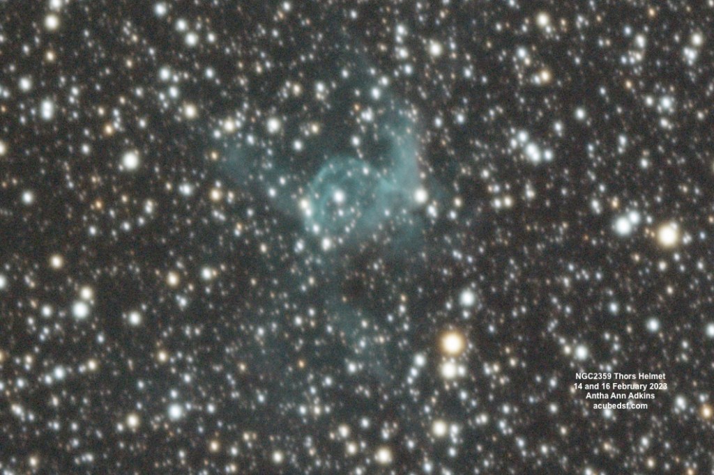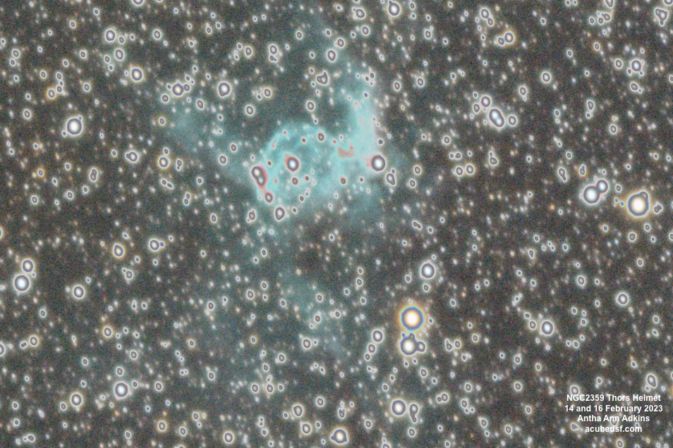 NGC 2359, also called Thor’s Helmet, is an emission nebula that is 15,000 light years away. It is a bubble of ionized gas around a hot central star, Wolf-Rayet WR7. It is 16 x 8 arc min in size, and I was pleasantly surprised that I could capture it with my small telescope. These pictures were made by stacking 64 3 minute images (and cropping).