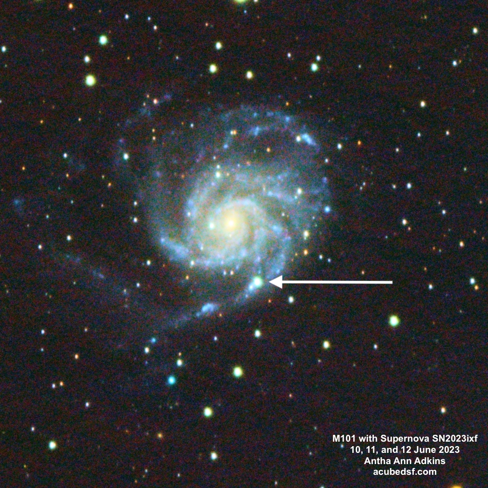 We recently went out to visit our favorite dark skies spot, Dell City, Texas, and we enjoyed 5.5 cloud-free nights and I collected over 30 hours of data. I spent most of that time on M101 and the supernova (arrow points to the supernova).