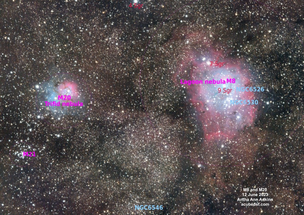 This is another image from the fabulous dark skies of Dell City, Texas. This is two nebulae – M8 Lagoon and M20 Trifid – from the constellation Sagittarius. M8 is an emission nebula of ionized hydrogen gas where star formation is taking place. It is 5200 light years away from us, has apparent dimensions of 90 x 40 arcmin, and has an apparent magnitude of 4.6. M20 is a combination of three types of nebulas: the red side is an emission nebula of ionized hydrogen gas where star formation is taking place, the blue side is a reflection nebula of a cloud of dust reflecting light from a nearby star, and the black lines are a dark nebula of an interstellar cloud dense enough to block the light from behind it. It is 4100 light years away from us, has an apparent dimension of 28 arcmin, and an apparent magnitude of 6.3.