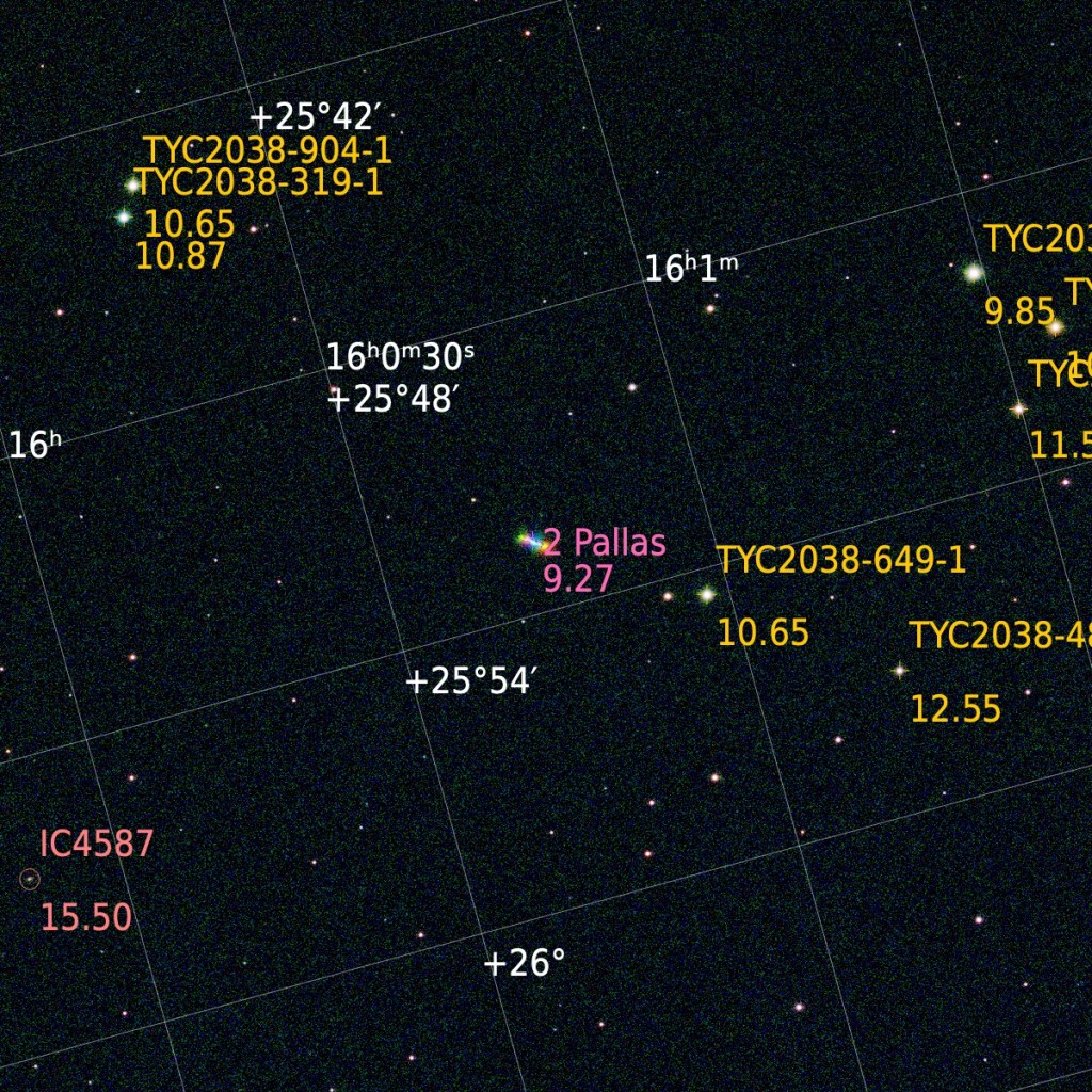 When I annotated the image, I noticed that there was a bright visible line that was not marked.  I suspected, given it was a line, indicating something moving slowly across the frame, that it was an asteroid, so I added annotation for asteroids to discover that it is the asteroid 2 Pallas.  The “2” in its name means it was the second asteroid to be discovered.  2 Pallas is a main belt asteroid, orbiting between Mars and Jupiter, in an unusually highly inclined (angle of orbital plane relative to the invariable plane) (Pallas’s inclination is 34.43 degrees; Vesta’s is 5.58 degrees; Earth’s is 1.58 degrees) and highly eccentric (more elliptical) orbit (Pallas’ eccentricity is 0.28; Vesta’s is 0.089; Earth’s is 0.017; 0 eccentricity is a circular orbit).