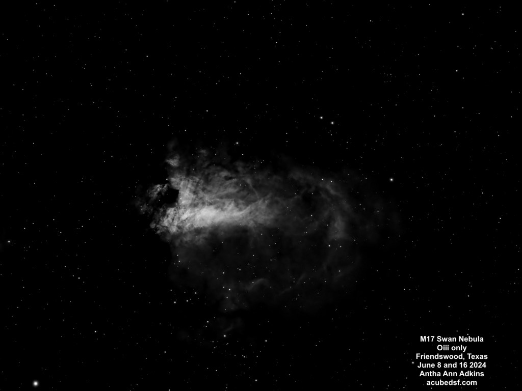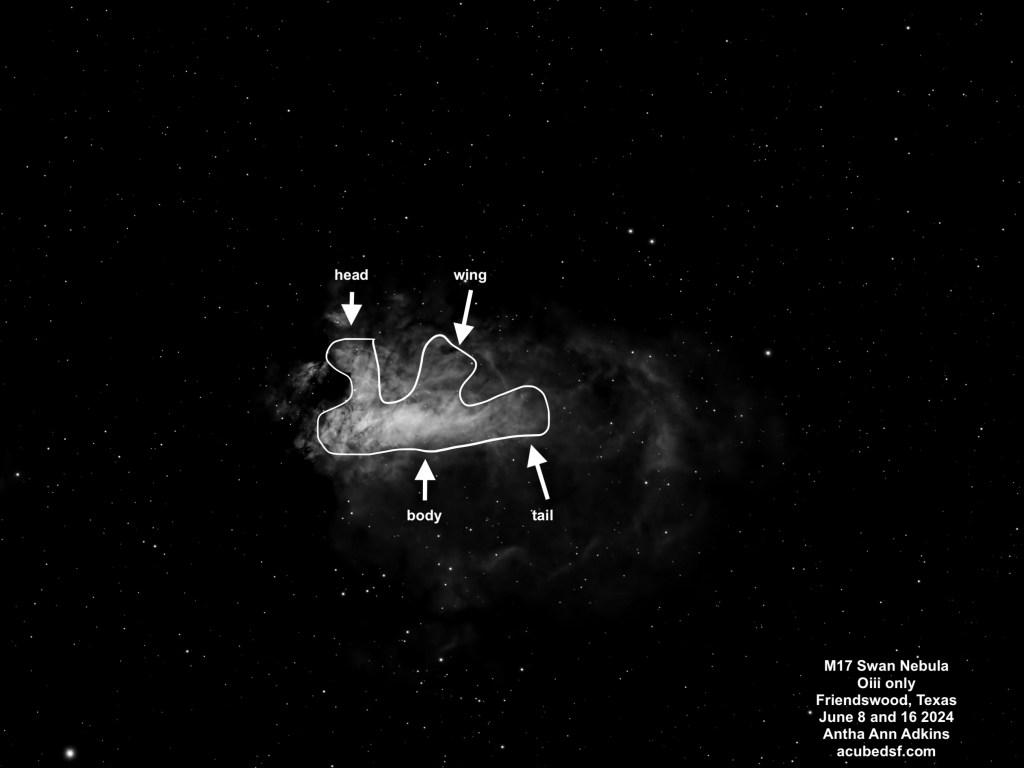 M17 is an emission nebula with many names, including the Swan Nebula.  When I saw the Oiii narrowband images, I finally understood why it is called the Swan Nebula, and I’ve oriented this image so that the swan is “floating” with its head up.  If you see the two dark spots near the center of the frame and the brightest part of the nebula, the lower one is the swan’s neck.  The largest portion of the bright part of the nebula is the swan’s body, the neck comes up past the dark spot, and then the head is above it.  I’ve included a single frame, below, where it the swan is more obvious because the rest of the nebulosity is hidden, and I’ve sketched in the swan on top of it.  Howard Banich has some lovely hand-drawn sketches of this nebula in a Sky & Telescope article