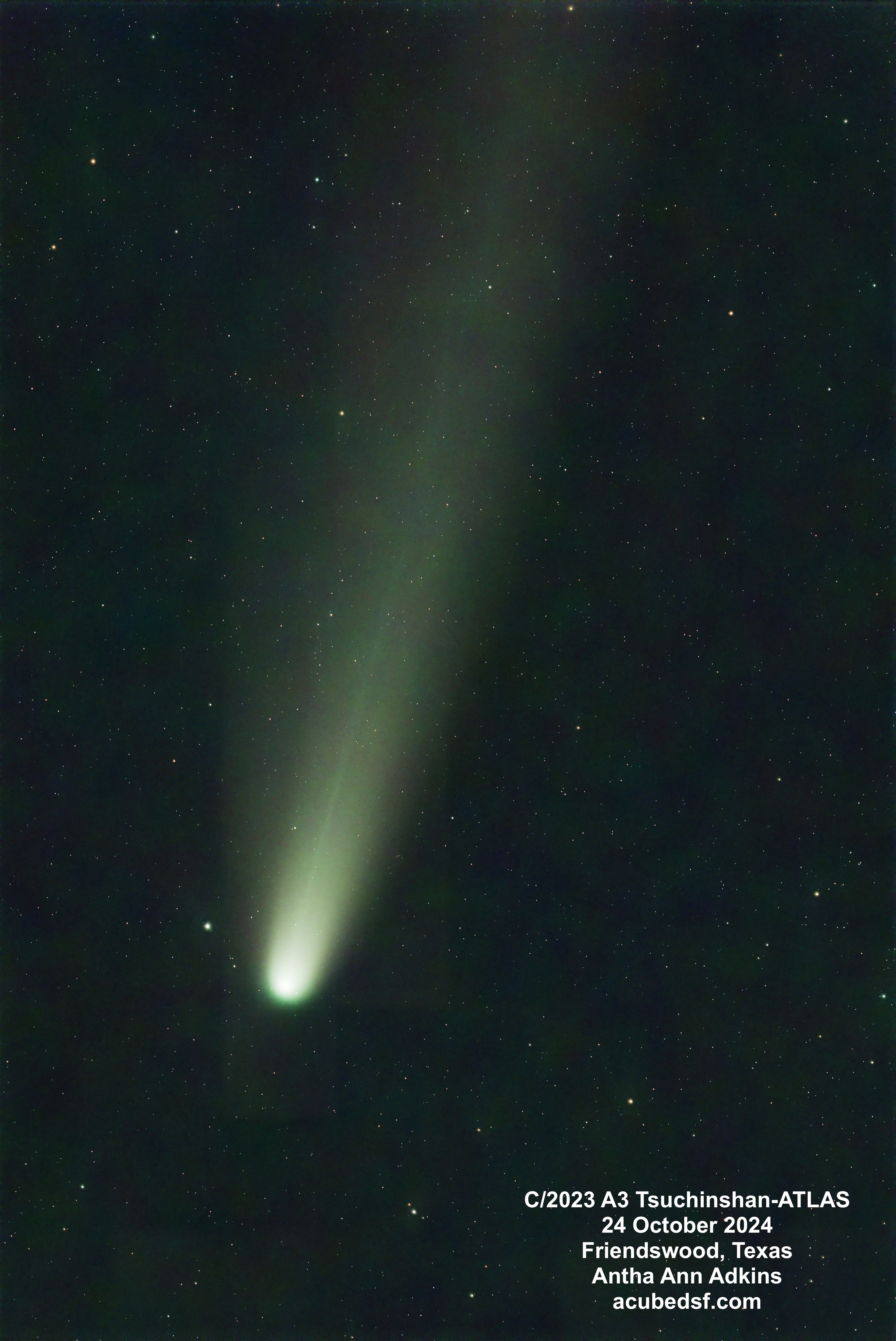 But now Comet C/2023 A3 Tsuchinshan Atlas is getting higher in the night sky, so it is no longer visible only at dusk. So I could set up my tracking mount and telescope to image it. The tail is still really long – much longer than I can capture in the field of view of my telescope!