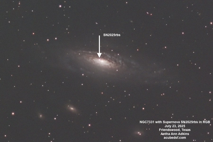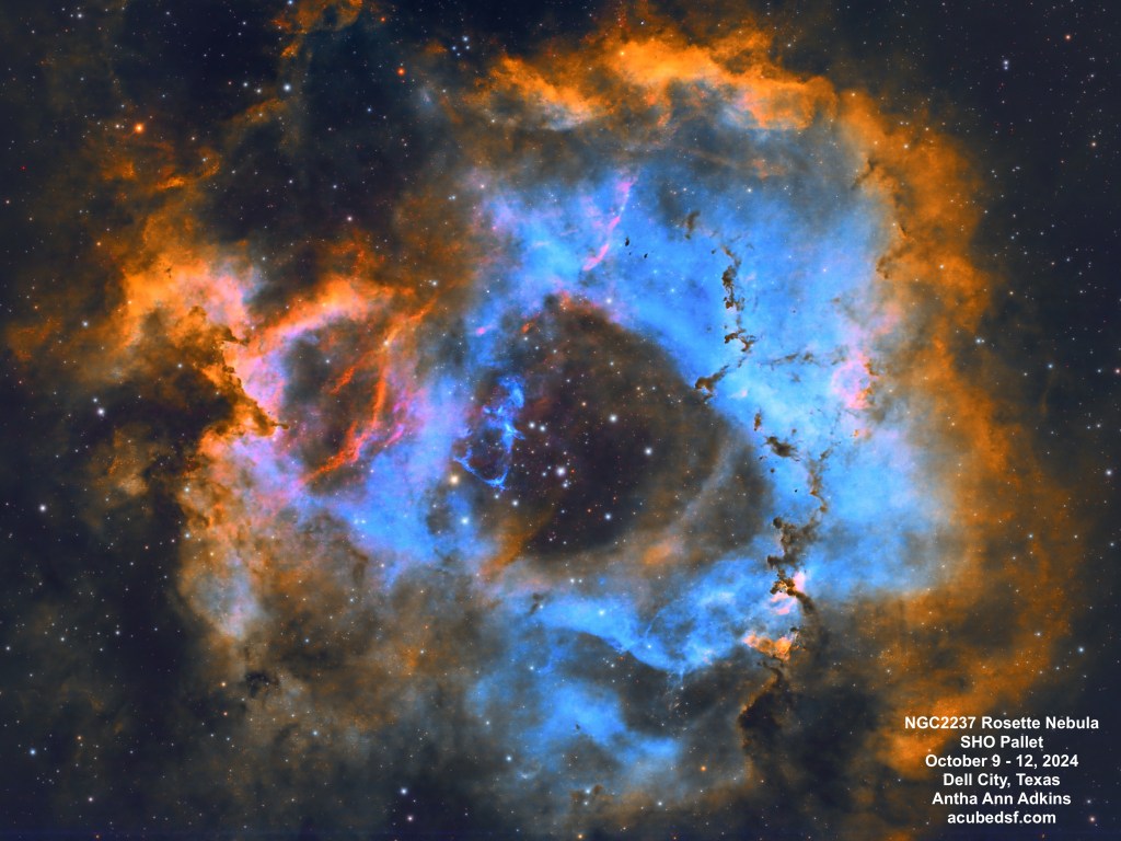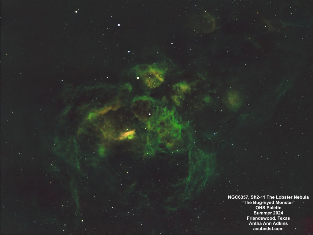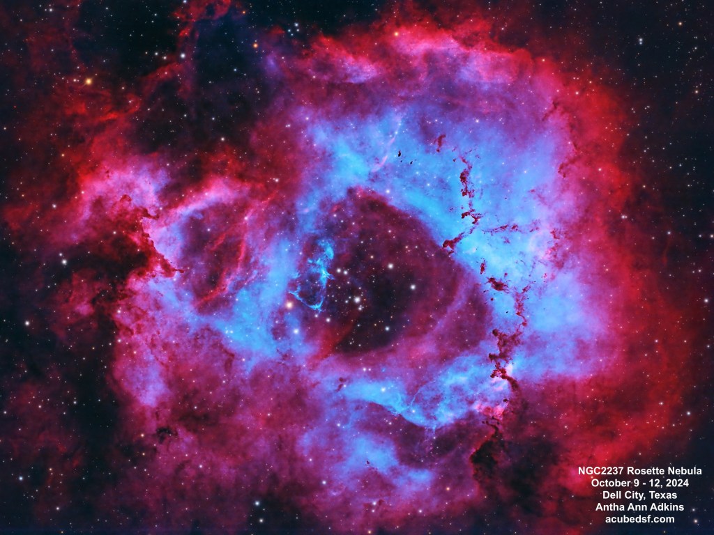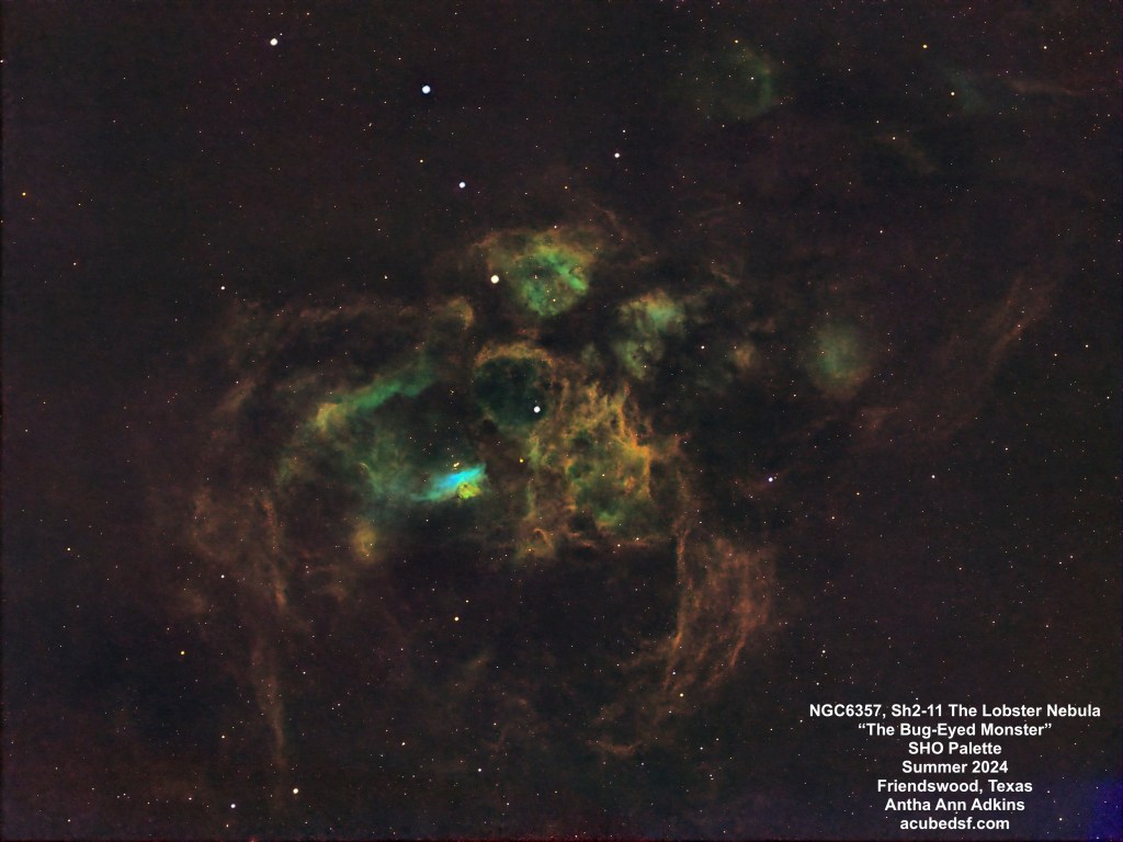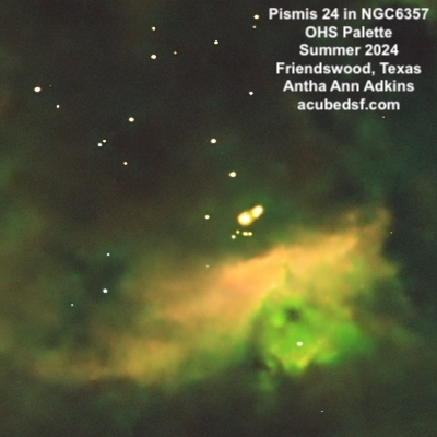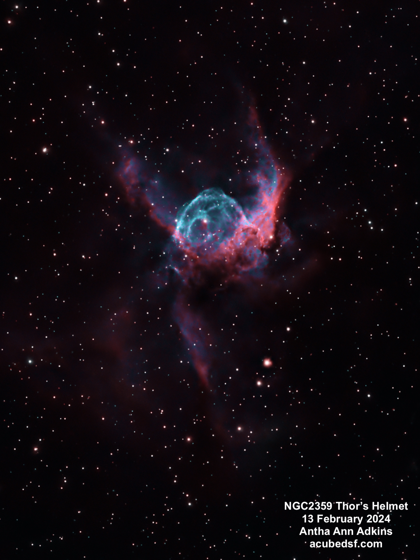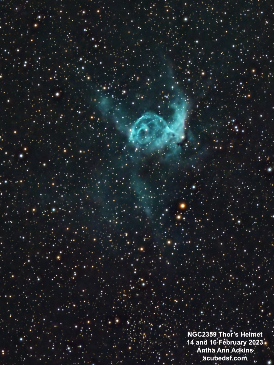 In this image, the stars came from images using red-green-blue filters with 12 to 33 minutes of data each, and the nebula came from images using Sulfer ii (7.4 hours of data mapped to red), Hydrogen alpha (2.8 hours of data mapped to green) and Oxygen iii (8.1 hours of data mapped to blue) filters, the standard SHO mapping. But after doing that mapping, I used Narrowband Normalization to shift the colors so that it wasn’t overly green and to enhance the reds and blues. This tool made getting the colors in this nebula look good a lot easier! The nebula was processed separately from the stars to maximally enhance it.